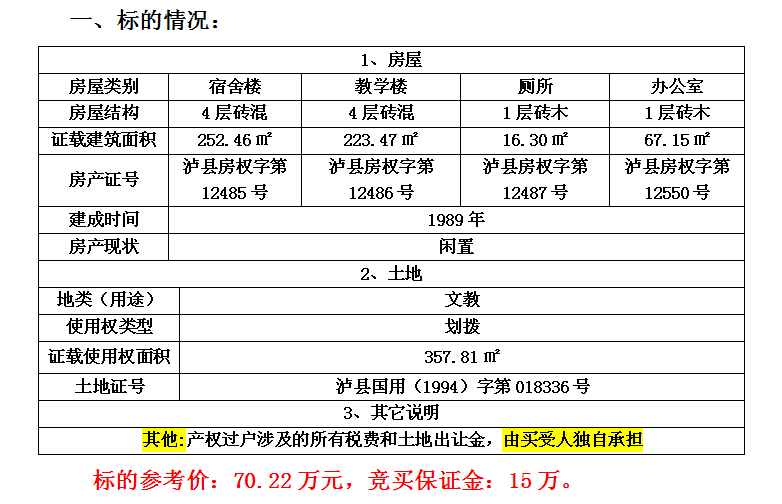 受瀘縣喻寺鎮(zhèn)人民政府委托,我公司將于2016年1月20日上午10時在瀘縣公共資源交易中心拍賣大廳公開拍賣瀘縣喻寺鎮(zhèn)廣東街(原喻寺鎮(zhèn)中心幼兒園)的房產(chǎn):