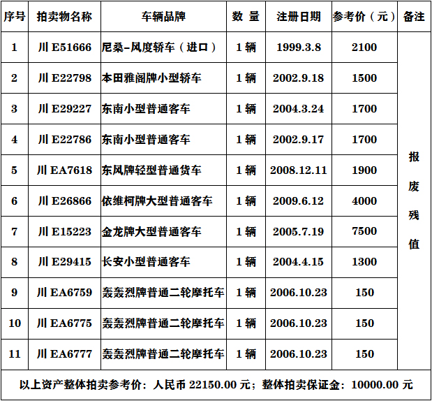 二、注意事項(xiàng):參與報(bào)廢車(chē)輛的競(jìng)買(mǎi)人必須具有收取報(bào)廢車(chē)輛的相關(guān)資質(zhì)。